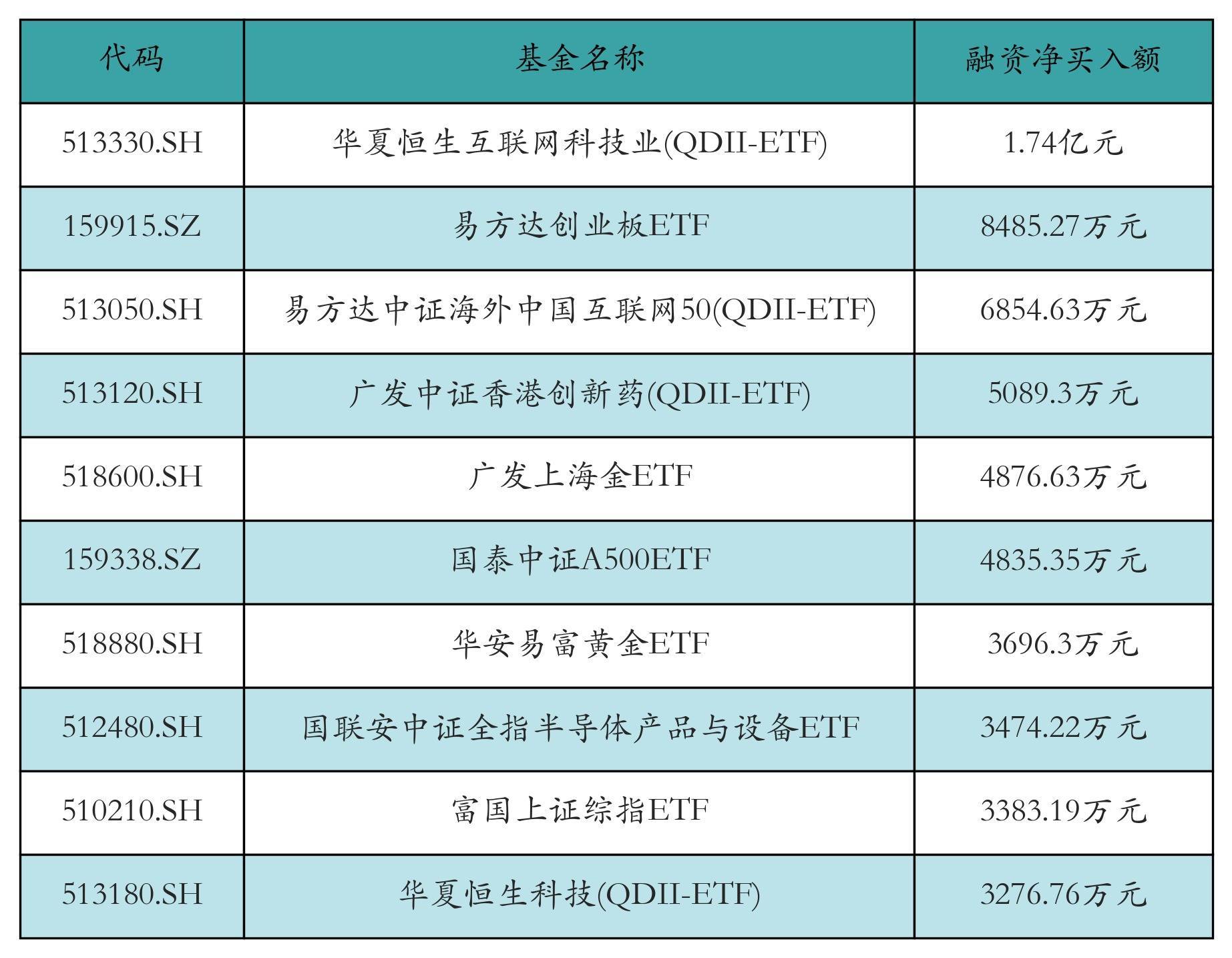 11月14日ETF融资净买入额前三位分别为:华夏恒生互联网科技业(QDII-ETF)(1.74亿元)、易方达创业板ETF(8485.27万元)和易方达中证海外中国互联网50(QDII-ETF)(6854.63万元),前10具体见下表: