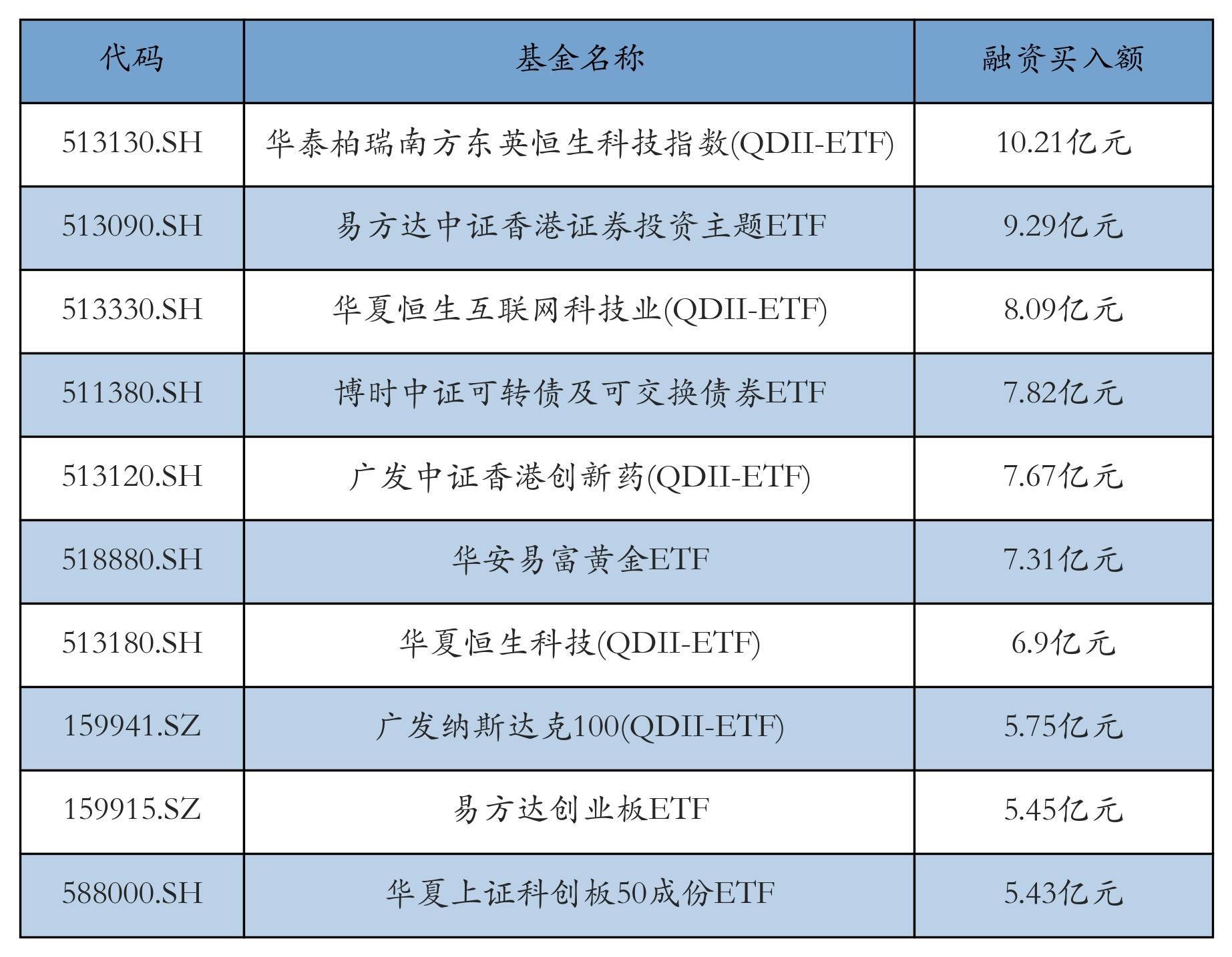 11月14日ETF融资买入额前三位分别为:华泰柏瑞南方东英恒生科技指数(QDII-ETF)(10.21亿元)、易方达中证香港证券投资主题ETF(9.29亿元)和华夏恒生互联网科技业(QDII-ETF)(8.09亿元),前10具体见下表:
