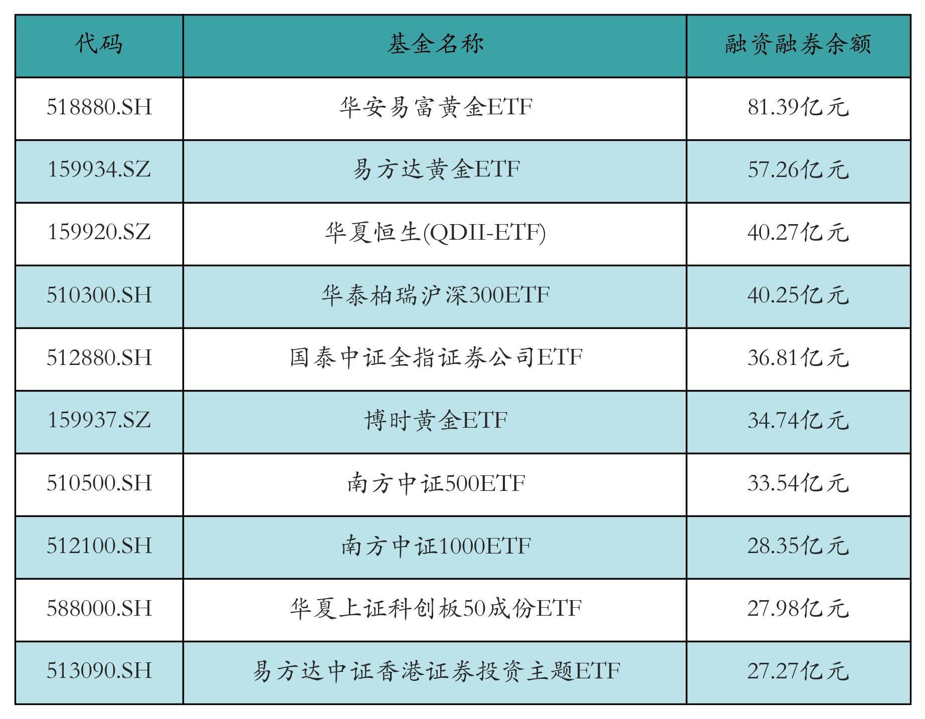 11月14日ETF两融余额前三位分别为:华安易富黄金ETF(81.39亿元)、易方达黄金ETF(57.26亿元)和华夏恒生(QDII-ETF)(40.27亿元),前10具体见下表: