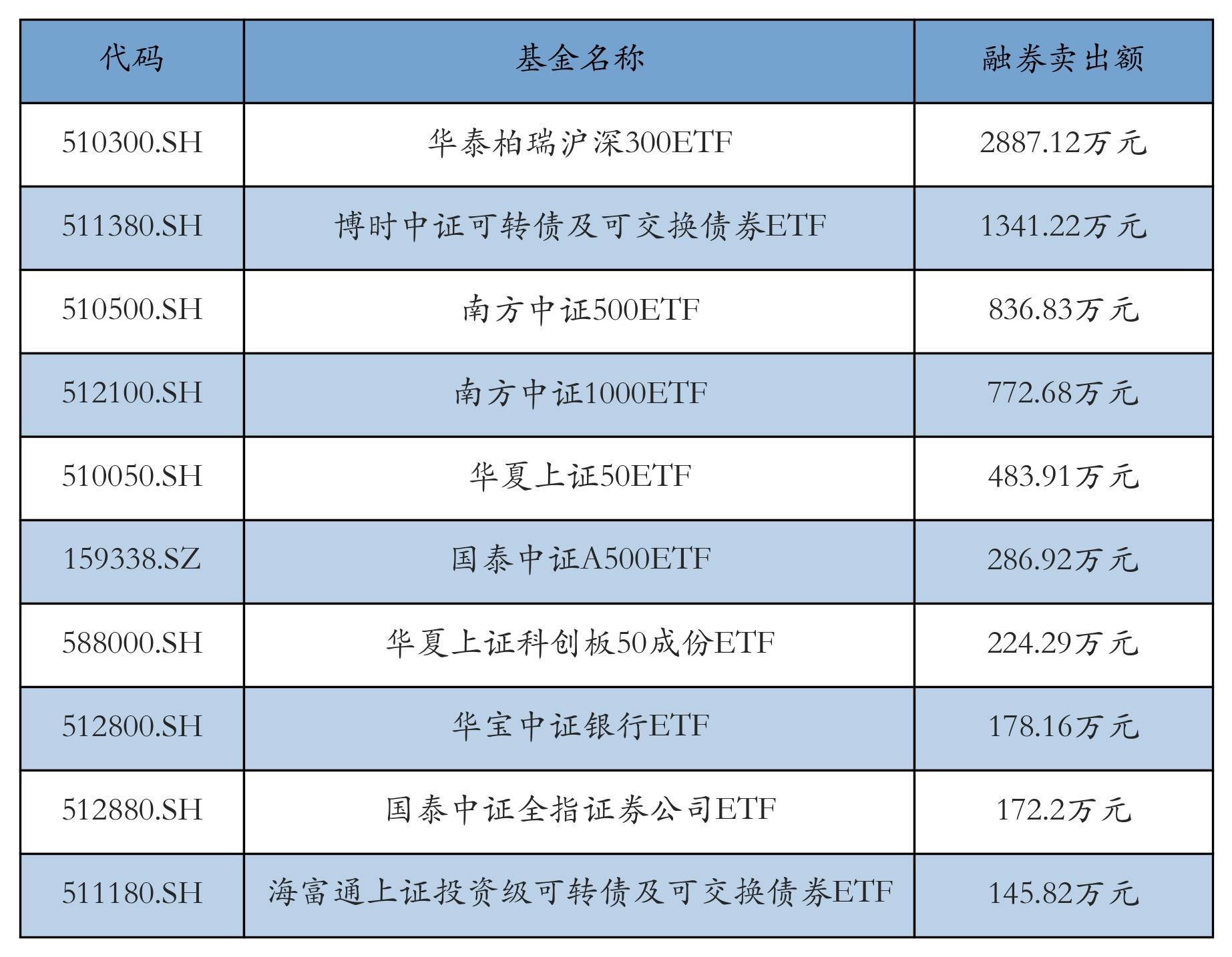 11月14日ETF融券卖出额前三位分别为:华泰柏瑞沪深300ETF(2887.12万元)、博时中证可转债及可交换债券ETF(1341.22万元)和南方中证500ETF(836.83万元),前10具体见下表: